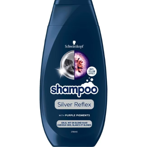 De Schwarzkopf Silver Reflex shampoo neutraliseert de gele gloed uit grijs, wit of blond gekleurd haar. Versterkt de haarstructuur. Zonder siliconen.